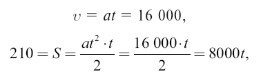 Нам известна из романа длина пушки – 210 м: это есть пройденный путь 5. Романист указывает и скорость снаряда у выхода из орудия – 16 000 м/с. Данные эти позволяют нам определить прежде всего величину t — продолжительность движения снаряда в канале орудия (рассматривая это движение как равномерно ускоренное). В самом деле: