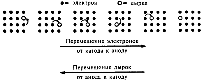 Представьте себе кристалл, одна часть которого имеет n-тип и подключена к «минусу» батареи, а вторая — p-тип и подключена к «плюсу». Когда цепь замкнута, электроны первой части отталкиваются от отрицательного электрода и устремляются к месту перехода между двумя половинами, а дырки второй части отталкиваются от положительного электрода и также устремляются к месту перехода. Там электроны нейтрализуют дырки и, отталкиваясь от положительного электрода, создают новые. Таким образом, все время, пока замкнута электрическая цепь, в кристалле течет ток.
