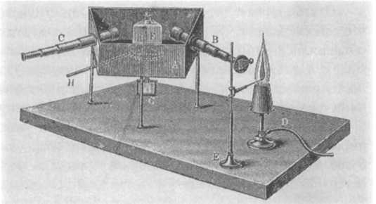 Спектроскоп, разработанный Кирхгофом совместно с Бунзеном, гравюра 1895 года.