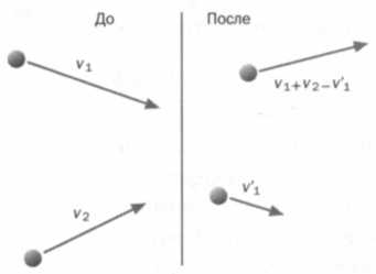 Скорости случайны до столкновения, но связаны между собой после него. Для большей ясности математика упрощена, как будто речь идет о столкновении водном измерении.