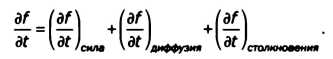 Изменение времени в функции распределения (левая сторона) задано результатом действия сил, диффузии и столкновений (правая сторона) при сложении всех возможных состояний энергии всех частиц газа.