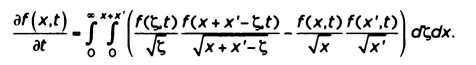 В этом случае f представляет собой функцию распределения. Член слева — ее производная относительно времени, она показывает изменение f с его течением; член справа — изменение f, вызванное силами, диффузией и столкновениями. Уравнение Больцмана утверждает, что любое изменение в f должно быть вызвано как минимум одной из этих трех причин. Уравнение, приведенное в статье 1872 года, гораздо сложнее, поскольку Больцман не довольствовался его представлением вне развития, вычислил вклад каждого члена и пришел к интегрально-дифференциальному уравнению, которое вначале было невозможно решить. Он рассмотрел изменение функции распределения, вызванное столкновением двух молекул, которые исходно имели некоторую энергию, а в итоге другую, отличную от нее. Его использование переменных нехарактерно для сегодняшнего дня: для начальной энергии двух молекул он оперировал буквами х и х'; для энергии после столкновения — буквами ? и выражением х + х' - ?, поскольку конечная энергия второй частицы равна разности между общей энергией пары до столкновения и энергией, которую получает на выходе первая молекула. Конечное уравнение имело следующий вид: