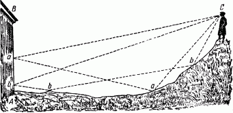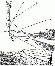 Другое дело, если вы поместитесь на уровне препятствия или даже чуть выше него (рис. 150). Звук, идущий вниз по направлениям Са, Cb, возвратится к вам по ломаным линиям СааС или CbbC, отразившись от почвы один или два раза. Углубление почвы между обоими пунктами еще более способствует отчетливости эхо, действуя как вогнутое зеркало. Напротив, если почва между точками С и В выпукла, эхо будет слабое и даже совсем не достигнет вашего уха: такая поверхность рассеивает лучи звука, как выпуклое зеркало.