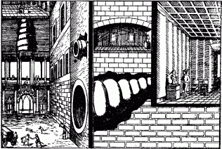 Строители средневековых замков нередко создавали такие звуковые курьезы, помещая бюсты либо в фокусе вогнутого звукового зеркала, либо у конца говорной трубы, искусно скрытой в стене. На рис. 152, заимствованном из старинной книги XVI века, можно видеть эти хитроумные приспособления: потолок в форме свода направляет к губам бюста звуки, приносимые извне говорной трубой; огромные говорные трубы, замурованные в здании, приносят разнообразные звуки со двора к каменным бюстам, размещенным у стен одной из зал, и т. п. Посетителю такой галереи казалось, что мраморные бюсты шепчут, напевают и т. п.