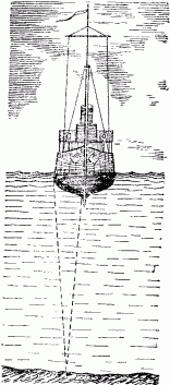 На рис. 153 вы видите схему установки. У одного борта корабля помещается в трюме, близ днища, патрон, порождающий при зажигании резкий звук. Звуковые волны несутся сквозь водную толщу, достигают дна моря, отражаются и бегут обратно, неся с собой эхо. Оно улавливается чувствительным прибором, установленным, как и патрон, у днища корабля. Точные часы измеряют промежуток времени между возникновением звука и приходом эхо. Зная скорость звука в воде, легко вычислить расстояние до отражающей преграды, т. е. определить глубину моря или океана.