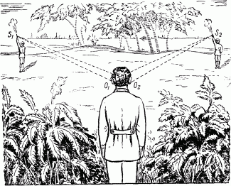 Но они зачастую бессильны определить положение источника звука, если он находится прямо впереди или позади нас (рис. 155): выстрел, произведенный впереди, нередко слышится как донесшийся сзади.