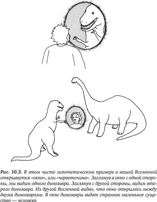 А теперь представьте, что внезапный порыв ветра унёс вашу шляпу в окно. Вы видите, как шляпа летит по воздуху в другой Вселенной, но нигде на Пятой авеню её нет. Тяжело вздохнув, вы отчаянным движением суёте руку в окно, чтобы поймать шляпу. Тираннозавр при этом видит, как шляпа вылетает из окна и скрывается из виду. Потом он видит, как из окна высовывается отделённая от тела рука, тщетно пытающаяся ухватить шляпу.