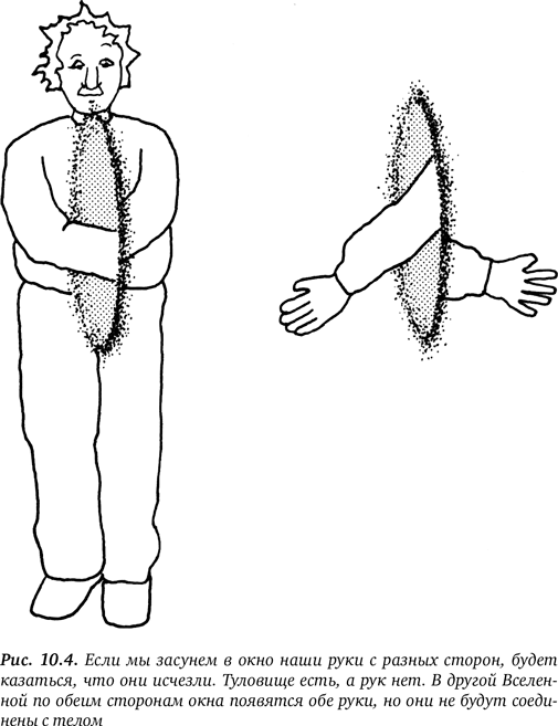 Что при этом видят динозавры? Они видят две судорожно машущие крошечные ручонки, высунувшиеся из окна с обеих сторон. А остального тела нет (рис. 10.4).