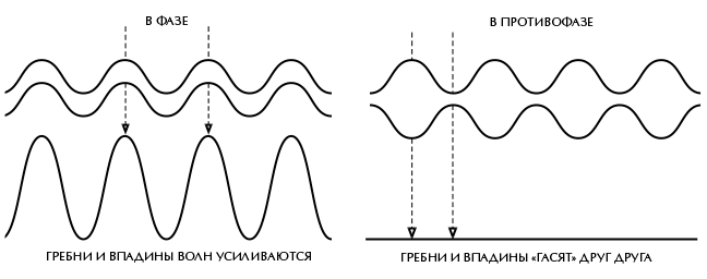 Хотя свет состоит из волн, квантовая гипотеза Планка предсказывает, что в некоторых отношениях он все же ведет себя так, как если бы состоял из частиц: свет может излучаться и поглощаться только дискретными порциями, или квантами. Точно так же из принципа неопределенности Гейзенберга следует, что частицы в некоторых отношениях ведут себя так же, как волны. Как мы уже видели, у них нет четкого положения, они «размазаны» в пространстве в соответствии с неким распределением вероятности. В основе квантовой механики лежит математический аппарат совершенно нового типа: он не описывает реальный мир как состоящий из объектов, которые можно однозначно отнести к частицам или волнам. В этих терминах описываются только наблюдения мира. Таким образом, в квантовой механике мы имеем дело с корпускулярно-волновым дуализмом: для некоторых задач бывает удобно рассматривать частицы как волны, для других – рассматривать волны как частицы. Одно из важных следствий такого подхода состоит в возможности наблюдения так называемой интерференции двух множеств волн или частиц. То есть гребни одного множества волн могут накладываться на впадины другого. В таком случае два множества волн ослабляют друг друга, а не суммируются, образуя более сильную волну, как можно было ожидать (рис. 4.1). Хорошо всем знакомым примером интерференции света могут служить мыльные пузыри. Явление это возникает при отражении света от двух стенок тонкой мыльной пленки, образующей пузырь. Белый свет состоит из волн разной длины, то есть волн разного цвета. Для волн некоторой длины гребни волн, отраженных от одной из стенок мыльной пленки, накладываются на впадины волн, отраженных от другой стенки пленки. Соответствующие этим длинам волн цвета отсутствуют в отраженном свете, который из-за этого воспринимается не как белый, а как окрашенный.