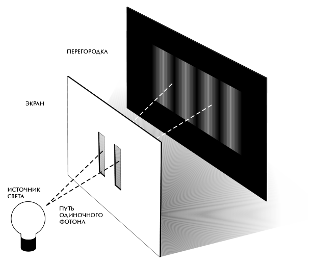 Удивительно, что точно такая же картина из полос наблюдается, если заменить источник света источником потока частиц, например электронов, движущихся с определенной скоростью. (Это означает, что соответствующие им волны имеют определенную длину.) Это особенно неожиданно, если учесть, что если в перегородке только одна щель, никаких полос не наблюдается – электроны равномерно распределяются по экрану. Логично предположить, что если сделать в перегородке вторую щель, то результатом будет простое увеличение числа электронов, попадающих в каждую точку на экране. Но из-за интерференции число электронов в некоторых местах, наоборот, уменьшается. Если отправлять электроны через щели по одному, то естественно было бы ожидать, что каждый электрон пройдет через одну из щелей и распределение электронов за перегородкой будет таким же, как если бы мы имели дело с прохождением электрона через единственную щель – то есть равномерное распределение на экране. Но в реальности интерференционная картина наблюдается, даже если электроны выпускать по одному. Таким образом, каждый электрон должен проходить одновременно через обе щели!