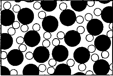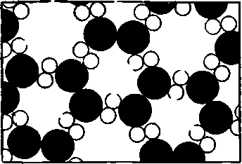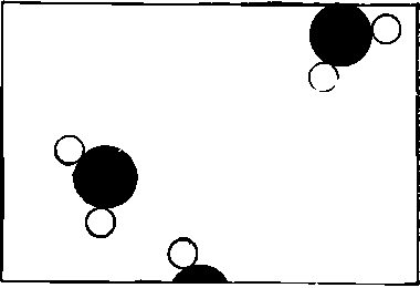 Это капля воды, увеличенная в миллиард раз, но, конечно, картина эта условная. Прежде всего частицы изображены здесь упрощенно, с резкими краями — это первая неточность. Для простоты они расположены на плоскости, на самом же деле они блуждают во всех трех измерениях — это во-вторых. На рисунке видны «кляксы» (или кружочки) двух сортов — черные (кислород) и белые (водород); видно, что к каждому кислороду пристроились два водорода. (Такая группа из атома кислорода и двух атомов водорода называется молекулой.) Наконец, третье упрощение заключается в том, что настоящие частицы в природе беспрерывно дрожат и подпрыгивают, крутясь и вертясь одна вокруг другой. Вы должны представить себе на картинке не покой, а движение. На рисунке нельзя также показать, как частицы «липнут друг к другу», притягиваются, пристают одна к одной и т. д. Можно сказать, что целые их группы чем-то «склеены». Однако ни одно из телец не способно протиснуться сквозь другое. Если вы попробуете насильно прижать одно к другому, они оттолкнутся.