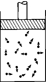 Давайте рассмотрим некоторые свойства водяного пара или других газов. Разрозненные молекулы пара то и дело ударяются о стенки сосуда. Представьте себе комнату, в которой множество теннисных мячей (порядка сотни) беспорядочно и беспрерывно прыгают повсюду. Под градом ударов стенки расходятся (так что их надо придерживать). Эту неумолкаемую дробь ударов атомов наши грубые органы чувств (их-то чувствительность не возросла в миллиард раз) воспринимают как постоянный напор. Чтобы сдержать газ в его пределах, к нему нужно приложить давление. На фиг. 1.3 показан обычный сосуд с газом (без него не обходится ни один учебник) — цилиндр с поршнем.