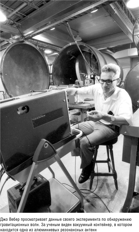 Вебер заинтересовался релятивизмом и гравитацией в середине 1950-х гг., проведя годовой творческий отпуск в общении с гуру физики Джоном Арчибальдом Уилером в Принстоне и Лейдене. Искривленный пространственно-временной континуум, ЧД, замедление времени, гравитационные волны – интересно! Он поставил себе целью узнать об этом все, что сможет, и в 1961 г. опубликовал маленькую книгу «Общая теория относительности и гравитационные волны» (General Relativity and Gravitational Waves).