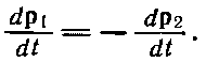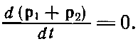 Но если скорости изменения все время равны по величине и противоположны по направлению, то и полное изменение импульса частицы 1 равно и противоположно полному изменению импульса частицы 2. Это означает, что если мы сложим эти импульсы, то скорость изменения суммы под воздействием одних только взаимных сил (их обычно называют внутренними силами) будет равна нулю, т. е.