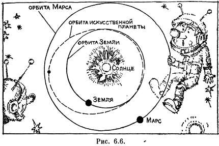 Какие же эллипсы описывают планеты? Оказывается, очень близкие к окружности Наиболее отличен от окружности путь ближайшей к Солнцу планеты — Меркурия. Но и в этом случае самый длинный диаметр эллипса всего лишь на 2 % больше самого короткого. Иное дело орбиты искусственных планет. Посмотрите на рис. 6.6. Орбиту Марса не отличишь от круга.
