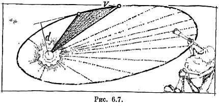 Из закона сохранения момента импульса следует постоянство величины mvd во время движения. Но если mvd неизменно, то не меняется и площадь треугольника vd/2. Мы можем начертить секторы для любых моментов времени — они окажутся одинаковыми по площади. Скорость планеты меняется, но то, что можно назвать секториальной скоростью, остается неизменным.