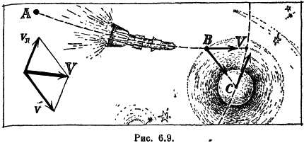 На рис. 6.9 изображена траектория ракеты, запущенной из точки А. Нарисована также траектория Луны. Можно представить себе, что по ней движется «сфера действия» Луны (внутри этой сферы практически на ракету действует одно лишь притяжение Луны).