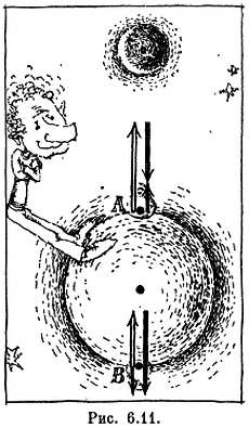 Перенесемся теперь к антиподам. В точке В ускорение, вызванное Луной, не больше, а меньше общего земного. Но мы находимся теперь на дальней от Луны стороне земного шара. Уменьшение притяжения Луной приводит на этой стороне земного шара к тем же результатам, что увеличение притяжения в точке А — к уменьшению ускорения свободного падения. Неправда ли, неожиданный результат — и здесь тело становится легче под действием Луны. Разность