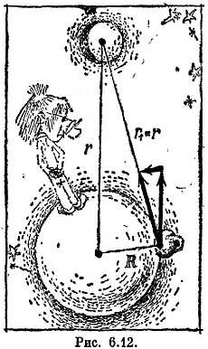 Иначе дело обстоит на средней линии. Здесь ускорения направлены под углом, и вычитание общего ускорения Земли Луною γ∙m/r2 и ускорения Луною лежащего на Земле тела γ∙m/r12 надо произвести геометрически (рис. 6.12).