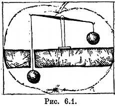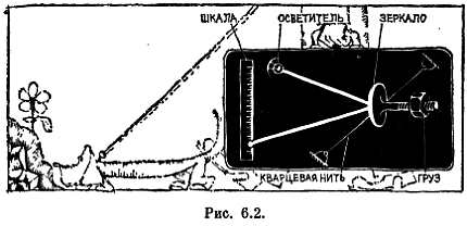 Существует несколько методов очень точного определения ускорения свободного падения. Можно найти g просто взвешиванием стандартного груза на пружинных весах. Геологические весы должны быть предельно чувствительны — их пружина изменяет растяжение при добавлении нагрузки меньше чем в миллионную долю грамма. Превосходные результаты дают крутильные кварцевые весы. Устройство их в принципе несложно. К горизонтально натянутой кварцевой нити приварен рычаг, весом которого нить слегка закручивается (рис. 6.2).