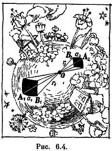 Рассмотрим силы тяготения, действующие в точке, лежащей внутри земного шара, со стороны внешнего слоя. Если разбить этот слой на тонкие слои, вырезать в одном из них маленький квадратик со стороной а1 и протянуть линии от вершин квадрата через точку О, тяжесть в которой нас интересует, то на противоположной стороне слоя получится квадратик другого размера со стороной а2 (рис. 6.4).