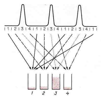 Рис. 8.7. Аналогичная схема, показывающая метод определения того, посылает ли звезда свет в виде импульсов. Свет с известной периодичностью (определенной по периоду радиоимпульсов) пробегает ряд счетчиков световых квантов. Здесь показано четыре счетчика, изображенных в виде ящиков, в которых «накапливаются» световые кванты (красные точки). Период делится на четыре интервала; кванты, поступившие за первый интервал, попадают в «ящик» 1, за второй в «ящик» 2 и т. д. В нашем случае больше всего квантов насчитал счетчик 3, остальные счетчики почти пусты.