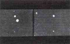 Рис. 8.8. Два снимка, полученные по методу двух телевизионных изображений (см. рис. 8.6), позволяют выявить звезду со снимка на рис. 8.5, которая посылает свет импульсами в ритме пульсара Крабовидной туманности. На рис. 8.5 эта звезда помечена белыми метками на правом и нижнем полях. Сравнивая рис. 8.5 и 7.6, легко найти на снимке пульсар Крабовидной туманности, который здесь ничем не отличается от других звезд. (Фото Ликской обсерватории.)