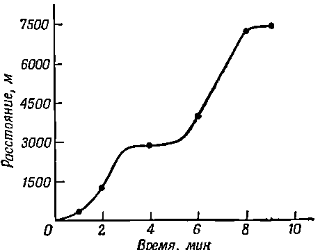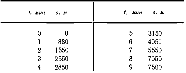 Через минуту после начала движения он проходит уже 380 м. Через две минуты он продолжает двигаться. Заметьте, что за вторую минуту он прошел большее расстояние, чем за первую, — автомобиль ускоряет свое движение, но между третьей и четвертой минутами что-то произошло, более того, на пятой минуте он остановился. По-видимому, у светофора, потому что дальше он опять набирает скорость и к концу шестой минуты проходит 4050 м, к концу седьмой — 5550, а к концу восьмой — 7050. Но в течение девятой минуты опять происшествие — автомобиль прошел всего лишь 450 м и остановился. Водитель нарушил правила движения и был остановлен полицейским.