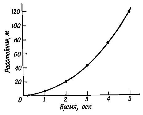 За нулевой момент выберем момент начала падения. Через 1 сек после начала падения шарик пролетает 5м, через 2 сек — 20 м, через 3 сек — 45м. Если отложить эти числа на графике, то получим параболическую кривую зависимости расстояния от времени для падающего тела (фиг. 8.2), которая описывается формулой