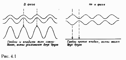 Несмотря на то что световое излучение состоит из волн, тем не менее, согласно гипотезе Планка, свет в каком-то смысле ведет себя так, как будто он образован частицами: излучение и поглощение света происходит только в виде порций, или квантов. Принцип же неопределенности Гейзенберга говорит о том, что частицы в каком-то смысле ведут себя как волны: они не имеют определенного положения в пространстве, а «размазаны» по нему с некоторым распределением вероятности. В квантово-механической теории используется совершенно новый математический аппарат, который уже не описывает сам реальный мир на основе представлений о частицах и волнах; эти понятия можно теперь относить только к результатам наблюдений в этом мире. Таким образом, в квантовой механике возникает частично-волновой дуализм: в одних случаях частицы удобно считать волнами, а в других лучше считать волны частицами. Из этого следует один важный вывод: мы можем наблюдать так называемую интерференцию между двумя волнами-частицами. Гребни волн одной из них могут, например, совпадать со впадинами другой. Тогда две волны гасят друг друга, а не усиливают, суммируясь, как можно было бы ожидать, в более высокие волны (рис. 4.1). Всем известный пример интерференции света — переливающиеся разными цветами радуги мыльные пузыри. Это явление возникает в результате отражения света от двух поверхностей тонкой пленки воды, которая образует пузырь. Белый свет содержит всевозможные длины волн, отвечающие разным цветам. Гребни некоторых волн, отраженных от одной из поверхностей мыльной пленки, совпадают со впадинами волн той же длины, отраженных от второй поверхности пузыря. Тогда в отраженном свете будут отсутствовать цвета, соответствующие этим длинам волн, и отраженный свет окажется разноцветным.