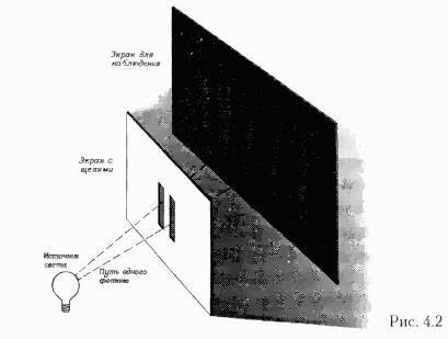 Итак, благодаря возникшему в квантовой механике дуализму частицы тоже могут испытывать интерференцию. Широко известный пример такой интерференции частиц — опыт с двумя щелями в экране (рис. 4.2). Рассмотрим экран, в котором прорезаны две узкие параллельные щели. По одну сторону от экрана со щелями помещен источник света какого-то определенного цвета (т. е. определенной длины волны). Свет в основном попадает на поверхность экрана, но небольшая его часть пройдет сквозь щели. Далее представим себе экран для наблюдения, установленный по другую от источника света сторону экрана со щелями. Тогда в любую точку экрана для наблюдения будут попадать световые волны из обеих щелей. Но расстояние, пройденное светом через щели от источника до экрана, будет, вообще говоря, разным. Это означает, что волны, прошедшие через щели, попадут на экран в разной фазе: в одних местах они будут ослаблять друг друга, а в других — усиливать. В результате на экране получится характерная картина, составленная из темных и светлых полос.