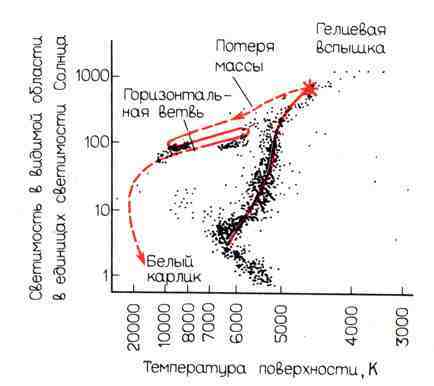Рис. 7.2. Диаграмма Г-Р, на которой схематически показан путь развития звезд, подобных нашему Солнцу. Вначале эти звезды долго находятся на главной последовательности. Затем они превращаются в красные гиганты (как показано на рис. 5.4). Там в их недрах начинается горение гелия (гелиевая вспышка). В состоянии красного гиганта звезда выбрасывает со своей поверхности так много вещества, что она постепенно начинает перемещаться по диаграмме вдоль горизонтальной ветви. Затем звезда, по всей видимости, превращается в белый карлик. Для сравнения на диаграмме показаны звезды из шарового звездного скопления МЗ, диаграмма Г-Р которого приведена на рис. 2.9.
