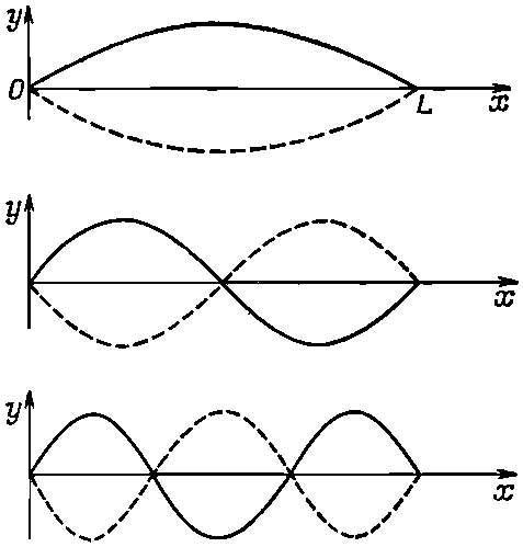 Фиг. 49.2. Первые три гармоники колеблющейся струны.