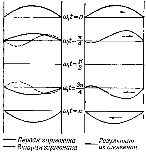 Предположим теперь, что одновременно с первой собственной гармоникой работает и вторая. Последовательные положения струны при возбуждении этой собственной гармоники показаны тоже на фиг. 49.3 пунктирной линией. По отношению к первой гармонике они сдвинуты по фазе на 90°. Это означает, что в начальный момент никакого отклонения не было, но скорости двух половинок струны направлены в противоположные стороны. Вспомним теперь общий принцип линейных систем: если взять любые два решения, то сумма их тоже будет решением. Поэтому перемещения, полученные сложением двух решений, показанных на фиг. 49.3, будут третьим возможным решением.