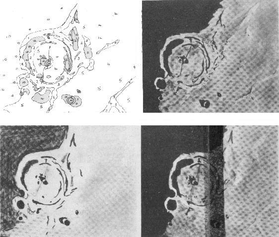 Рис. 54. Последовательные стадии зарисовок кратера Посидоний, сделанных Дж. Д. Гринвудом. Набросок кратера (слева) с численными оценками интенсивностей деталей помогают при его дальнейших зарисовках (ср. рис. 99). Начиная с самых плотных темных деталей, постепенно с помощью карандаша и ластика выделяют более тонкие черты рельефа.