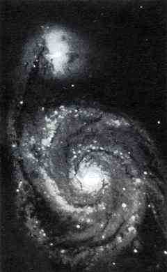 Рис. 0.4. Спиральное облако М51 в созвездии Гончих Псов. Мы смотрим перпендикулярно плоскости Млечного Пути. Светлые спирали — места, где яркие голубые звезды возбуждают свечение межзвездного газа. Свет от этих звездных систем дошел до нас примерно за 12 миллионов лет. (Снимок Военно-морской обсерватории США, Вашингтон.)