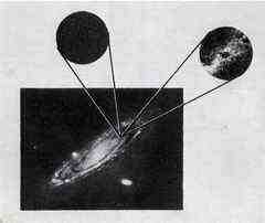 Большинство звезд Млечного Пути расположено в плоском, спиральном скоплении, которое мы называем нашей Галактикой. Она так велика, что свет идет от одного ее края до другого сто тысяч лет. Все звезды движутся вокруг центра Галактики по сложным траекториям, которые определяются конкуренцией гравитационного притяжения и центробежных сил. Наша Галактика — Млечный Путь — вращается вокруг своей оси. Во Вселенной много галактик, подобных нашей. Другое такое же скопление звезд, медленно вращающееся вокруг своей оси, — Туманность Андромеды. На рис. 0.1 изображена фотография этой звездной системы. Диск этой галактики кажется нам эллипсом, поскольку мы видим его под некоторым углом. Туманность Андромеды — точная копия нашей Галактики. В ней мы находим все типы звезд, имеющиеся в нашем Млечном Пути, все процессы, протекающие в нашей Галактике. И не только в Туманности Андромеды, поскольку существуют тысячи, миллионы, а может быть, и бесконечное множество других галактик.