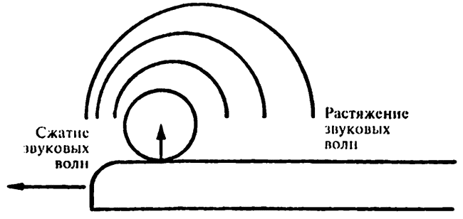 Высота тона изменяется, если источник звука перемещается относительно слушателя. Предположим, что стоящий вдалеке поезд издает гудок, который имеет частоту 344/с. В этом случае, когда звуковая волна достигает нас, в нашу барабанную перепонку каждую секунду будут ударять 344 комбинации сжатия/разрежения. Поскольку звук (при комнатной температуре) двигается со скоростью 344 метра в секунду, последовательные области сжатия будут располагаться на расстоянии одного метра.