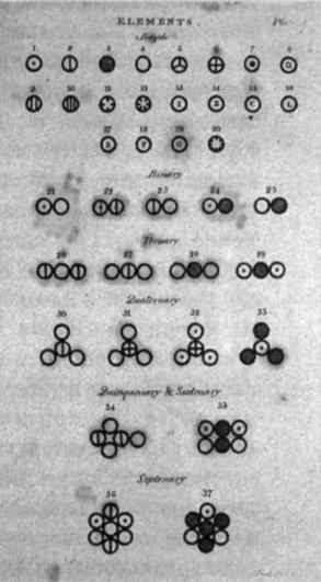 Страница книги Дальтона «Новый курс химической философии» (1808), на которой представлены символы, использованные им для обозначения каждого из атомов (вверху). Внизу приведены символы сложных веществ, образованных двумя или более атомами.