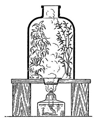 Поместим сорванные ветви под стеклянный колпак. Как я не раз говорил, им может служить бутылка с отрезанным дном. Колпак поставим на доску с прорезанным в середине ее отверстием, в которое вставим фарфоровую чашечку.