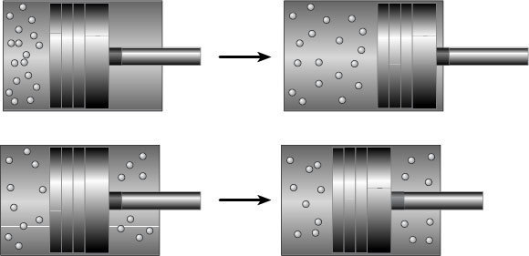 Снова вернемся к нашему контейнеру с перегородкой. Но на этот раз пусть это будет не перегородка с отверстием, жестко зафиксированная внутри контейнера и лишь позволяющая некоторой части молекул пролетать из одной его половины в другую, а сплошная подвижная пластина, прикрепленная к стержню, выходящему за пределы контейнера. То, что мы сейчас описали, — всего лишь обыкновенный поршень, с помощью которого при определенных обстоятельствах можно производить работу.