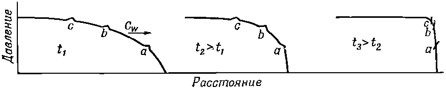 Фиг. 51.3. «Мгновенные снимки» ударного фронта в последовательные моменты времени.