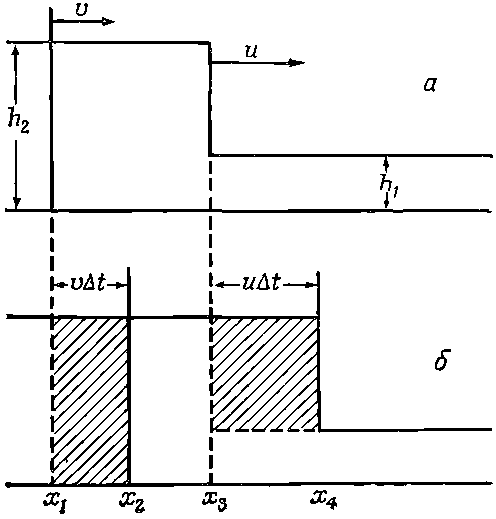 Применим теперь законы сохранения вещества и импульса. Возьмем сначала первый из них: мы видим, что на единицу ширины канала количество вещества h2v?t, прошедшее мимо точки x1 (область, заштрихованная на фиг. 51.5,б), компенсируется другой заштрихованной областью, представляющей количество вещества (h2-h1)u?t. Разделив на ?t, получим vh2=u(h2-h1). Но этого еще недостаточно, так как, хотя нам известны h1 и h2, мы еще не знаем ни u, ни v, а хотим найти обе величины.