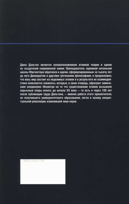 Джон Дальтон является основоположником атомной теории и одним из создателей современной химии. Преподаватель скромной начальной школы Манчестера обратился к идеям, сформулированным за тысячу лет до него Демокритом и другими греческими философами, и предположил, что весь мир состоит из неделимых атомов и в результате их взаимодействия появляются элементы, которые, в свою очередь, образуют химические соединения. Несмотря на то что существование атомов вызывало серьезные споры вплоть до начала XX века - то есть и через 100 лет после публикации труда Дальтона. - именно работа этого просветителя, не получившего университетского образования, легла в основу концептуальной революции, изменившей лицо науки.