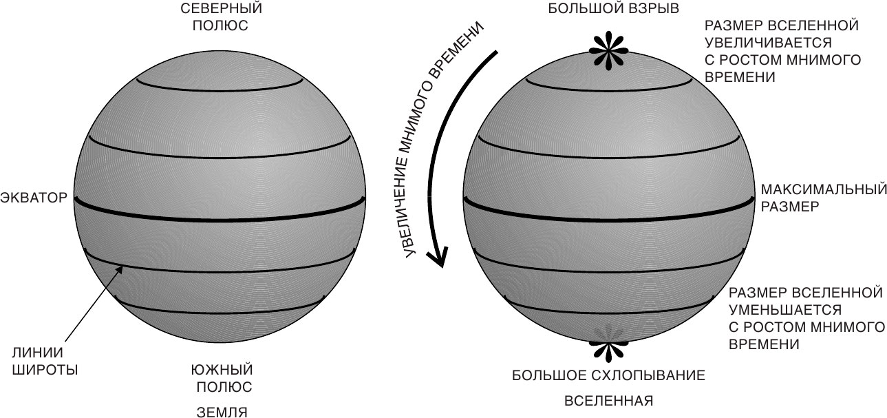 В классической теории гравитации, использующей действительное пространство-время, возможны лишь два типа поведения Вселенной: либо она существовала в течение бесконечного времени, либо ее началом была сингулярная точка в какой-то конечный момент времени в прошлом. В квантовой же теории гравитации возникает и третья возможность. Поскольку используются евклидовы пространства, в которых временна?я и пространственные оси равноправны, пространство-время, будучи конечным, может тем не менее не иметь сингулярностей, образующих его границу или край. Тогда пространство-время напоминало бы поверхность Земли с двумя дополнительными измерениями. Поверхность Земли имеет конечную протяженность, но у нее нет ни границы, ни края: поплыв по морю в сторону заката, вы не вывалитесь через край и не попадете в сингулярность (я это знаю, сам объехал вокруг света!).