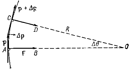 Поскольку сила перпендикулярна скорости, кинетическая энергия, а значит, и абсолютная величина скорости остаются постоянными. Действие магнитного поля сводится только к изменению направления движения. За малый промежуток времени ?t вектор импульса изменится на величину ?р=F·?t, направленную перпендикулярно импульсу, т. е. вектор импульса р повернется на угол ??=?р/р=qvB?t/p, так как |F|=qv·|В|. Но за то же время электрон пройдет расстояние ?s=v?t. Две прямые, АВ и CD, очевидно, пересекутся в точке О, для которой ОА=ОС=R, причем ?s=R??. Комбинируя написанные формулы, мы получаем R??/?t=R?=v=qvBR/p, откуда