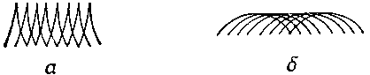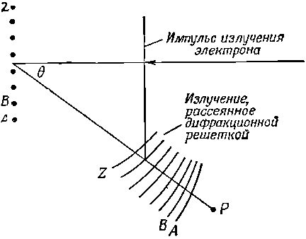 Но точка Р расположена ближе к одному концу решетки, и поэтому излучение попадает в нее сначала от А, потом от В и т. д., наконец, последним приходит импульс от самой крайней линии. В итоге совокупность всех отраженных волн принимает такой вид, как показано на фиг. 34.6,а.