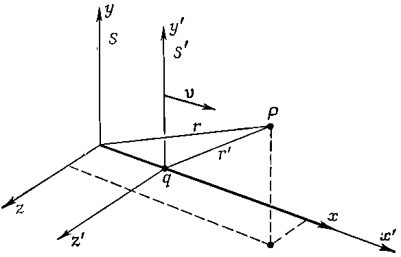 Рассмотрим один пример плодотворности идеи 4-потенциала. Чему равны векторный и скалярный потенциалы заряда q, движущегося со скоростью v в направлении оси х? Задача очень упрощается в системе координат, движущейся вместе с зарядом, ибо в этой системе заряд покоится. Пусть заряд находится в начале координат системы S', как это показано на фиг. 25.2.