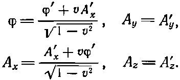 Теперь без особых хитростей можно найти потенциалы ? и А в неподвижной системе координат. Соотношениями, обратными к уравнениям (25.24), будут