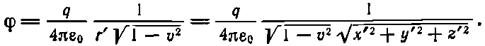 причем r' — расстояние от заряда q до точки в движущейся системе, где производится измерение поля. Векторный же потенциал А', разумеется, равен нулю.